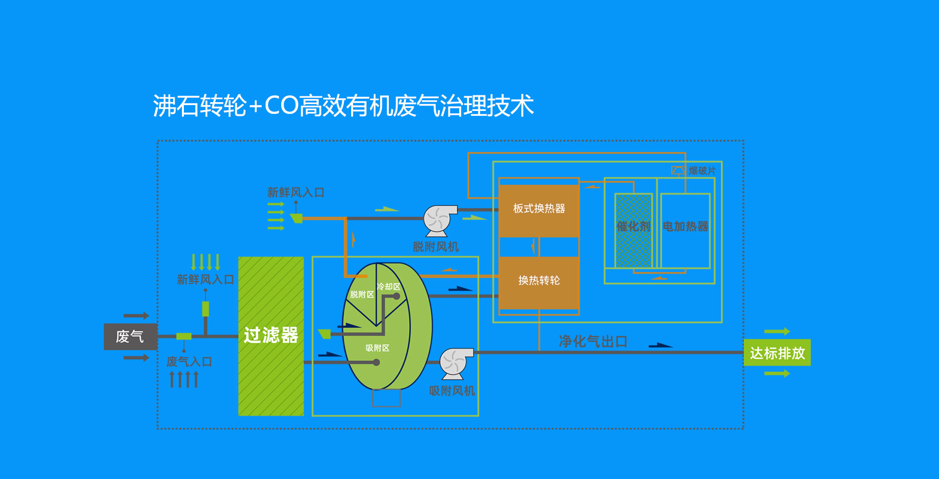 大風量、低濃度的有機廢氣的高效治理技術,適用于連續(xù)運行,降低設備投資及運維能耗。